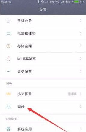 2、这时会打开小米手机的设置页面,在页面中点击“同步”菜单项;