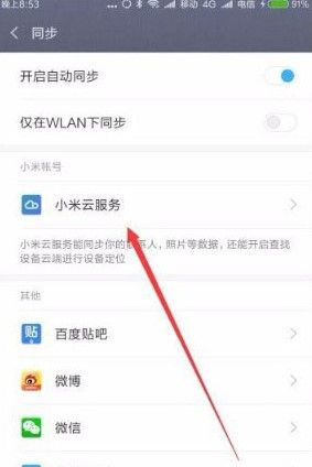 3、这时就会打开同步设置页面,在页面中点击“小米云服务”菜单项;