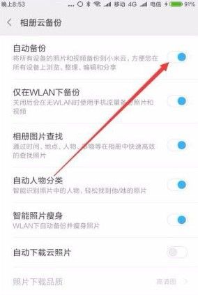 5、这时同样可以打开相册云备份页面,同样点击“自动备份”菜单项后,就会关闭了小米相册的云备份功能了。