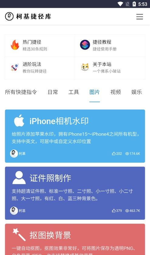 柯基捷径库证件照官网版入口汇聚了众多工具功能的宝箱,一个帮助用户省力省钱的多功能工具箱,聚合生活服务,外卖券、出租车券、特价、订餐、交通卡、特别会议、商品历史价格查询、外卖红包、iPhone摄像头水印、ID照片、抠图等功能,还提供丰富的iOS快捷命令脚本,用户可以在这里找到各种实用的功能工具,用户可以打开各种自定义快捷指令,内置各种场景功能工具,自动完成任务等,支持免费创建和使用,操作起来也是十分的简单方便,感兴趣的小伙伴欢迎点击下载下来吧。