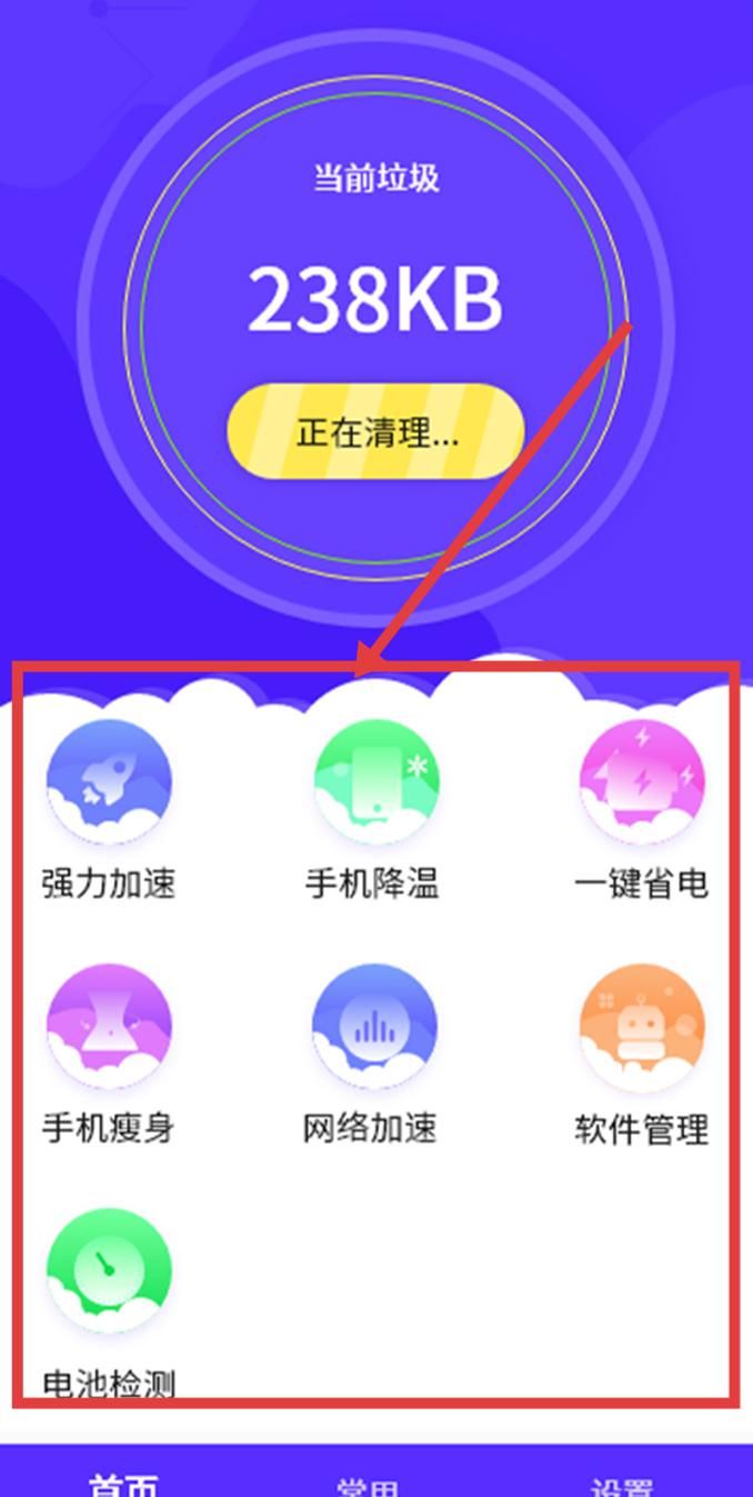 1、清理软件界面,显示当前垃圾238KB及正在清理状态,下方红框内有强力加速、手机降温等功能按钮,满足多样优化需求。