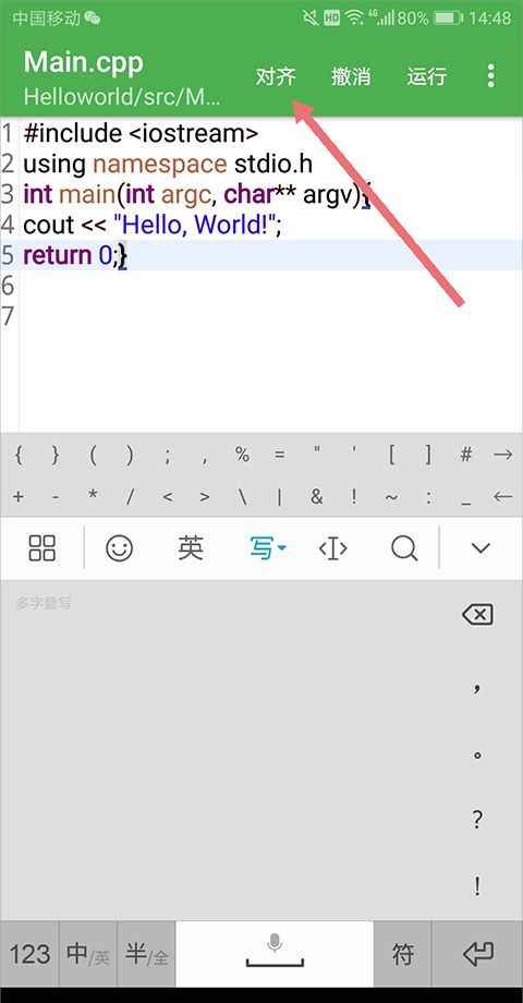 2、代码输入完后,点击【对齐】(下图红色箭头所指)