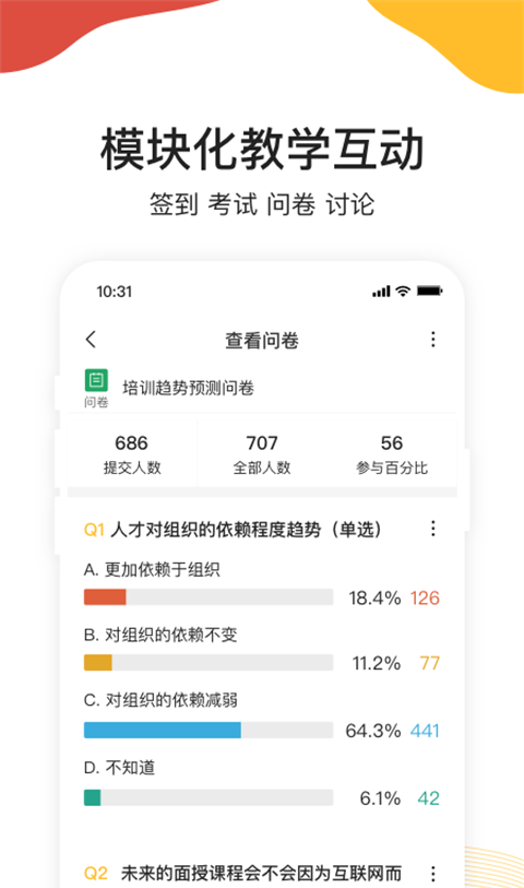 1.强大的课程管理系统。问卷模板的自由组合、互动活动的实时控制和日历视图使课程安排井然有序。