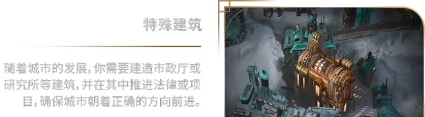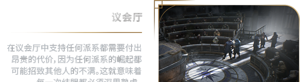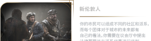 你的市民希望能在城市的管理运营方面参与意见。每个派系都有自己的意识形态和对未来的想法,但也有一个共同点——对权力的无尽渴求。你必须在议会厅中谨慎选择盟友。