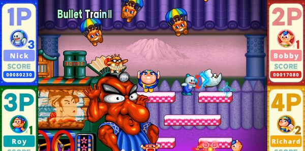 雪人兄弟2 Special是TOAPLAN于1994年发行的“雪人兄弟2”的重制版,其IP授权目前由TATSUJIN管理。游戏继承了原作中的主要情节,讲述了营救被恶魔抓走的公主的故事,并进一步对个性鲜明的4位主角进行了角色设计和画面的升级,以符合当代的风格。