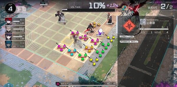 采用AP(行动力)管理系统,玩家需在回合制战斗中合理分配角色移动、攻击与技能释放。战场设计强调“连杀多米诺效应”——击杀敌人可恢复AP,形成战术循环。不同角色拥有独特技能,例如双马尾少女的“疲劳再动”、眼镜男的团队增益等,需根据敌人类型(如自爆杂兵、高血精英)灵活搭配。