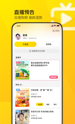 1、美团直播助手软件内置三大功能,分别为直播预告、轻松卖货和一键开播。