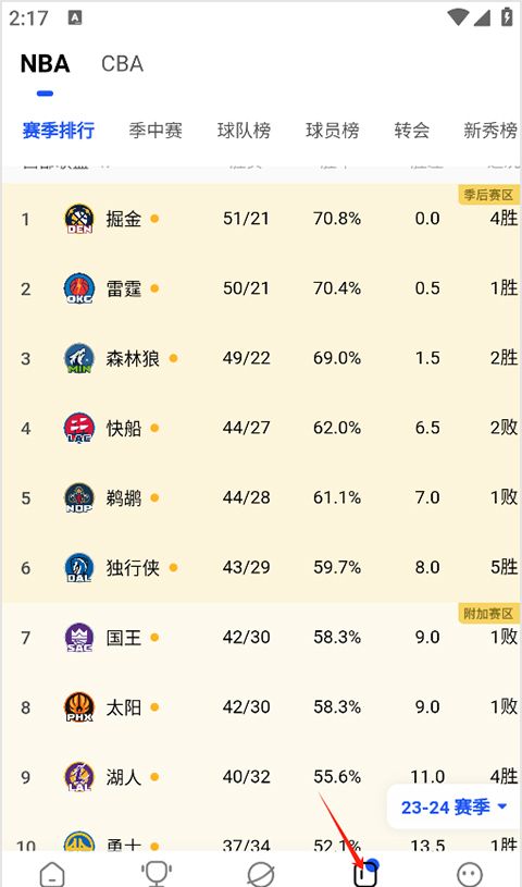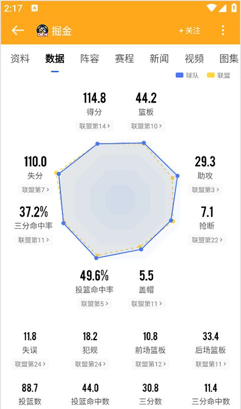 3、数据中心主要提供东西方球队排名,球员得分榜,助攻榜,盖帽榜,抢断榜,篮板榜,失误等数据排名。