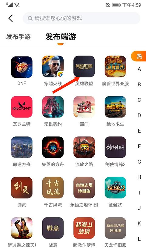 2、进入发布端游界面,选择相应的端游,这里以【英雄联盟】为例,