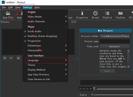 1、打开Shotcut,在主界面点击“Settings”菜单,在下拉选项中选择“Language”;