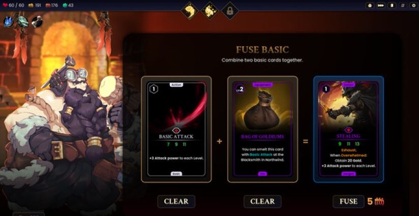 战斗奖励可熔炼为宝石镶嵌、卡牌复制或融合升级,相同卡牌三合一会觉醒为传说变体,每张强化卡都保留原始插画细节。