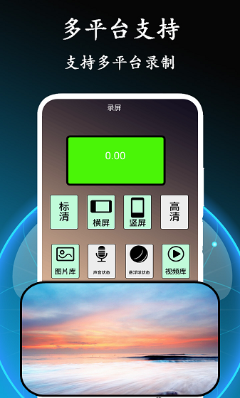 1、画中画模式:支持前置摄像头的小窗口录制,实现人脸和屏幕的同一帧,适用于游戏解说和教学视频。