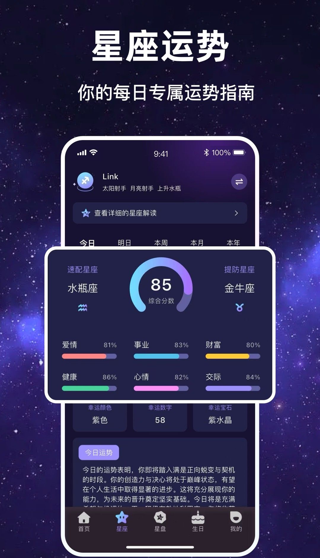 1、星座运势:综合分析用户日常运势,包括爱情、事业、财富等方面的变化。