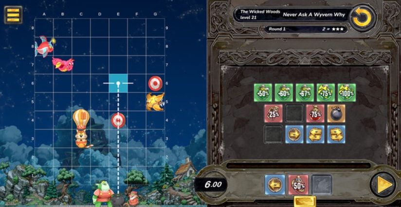 每一关都会提供一组动作方块,可以插入到动作序列中。序列长度因谜题而异,并从左到右执行。动作包括:左右移动、药水增强或削弱大炮威力、爆炸物库,以及“等待”和“循环”等辅助操作。