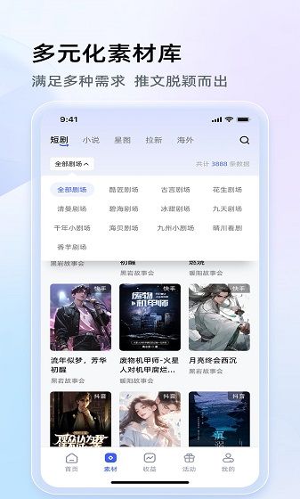 1、素材丰富:提供海量热门小说片段、爆款短剧剧本及高清影视剪辑资源,一键获取创作素材。