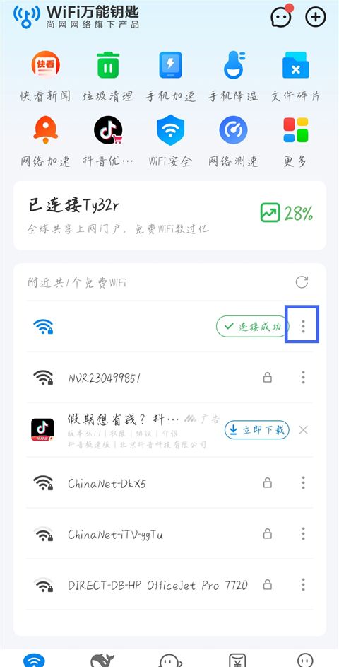 1、打开WiFi万解钥匙,点击已连接的wifi的三点标识。