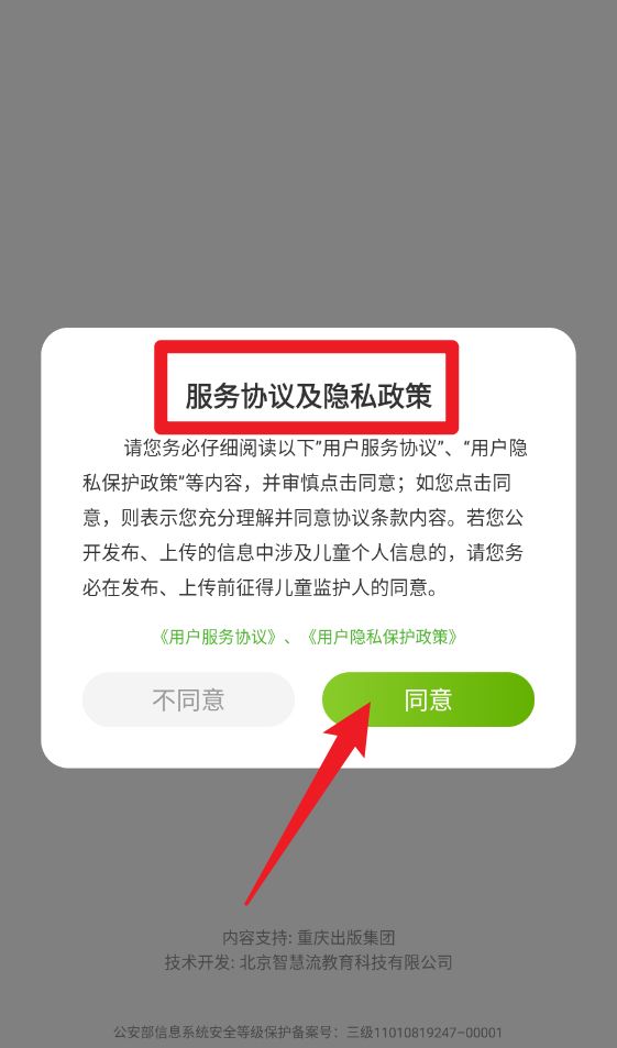 1、首次打开冀教学习APP时,会弹出【服务协议及隐私政策】,请认真阅读并点击【同意】,即可继续使用应用。