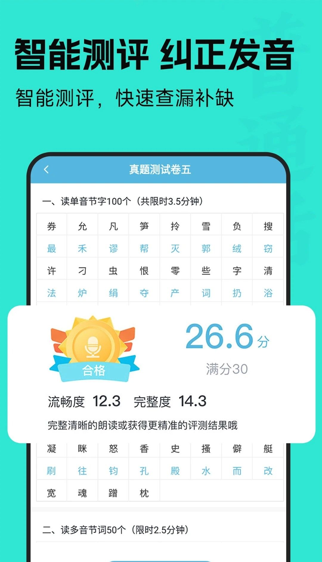 2、考试辅助:帮助用户通过普通话水平测试,说标准流利的普通话,提高个人语言能力。