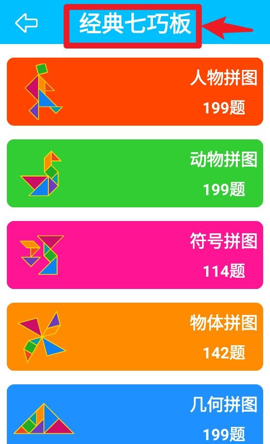 2、在经典七巧板菜单中,选择人物拼图、动物拼图等类别,逐题挑战不同主题的拼图任务。