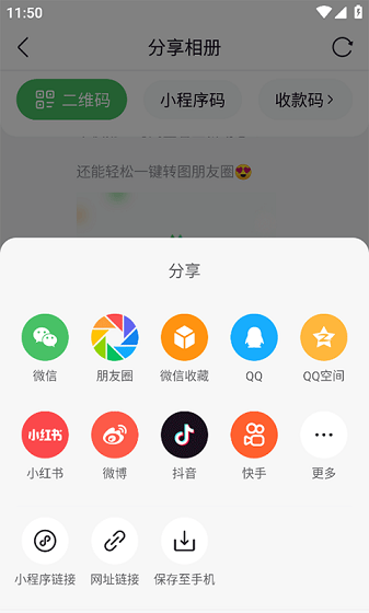 3、微购相册支持分享到微信、朋友圈、QQ、小红书、微博、抖音以及快手等各大平台。
