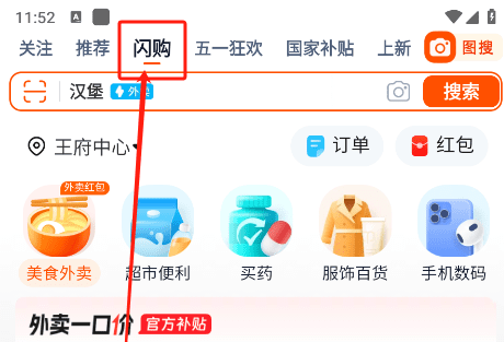 1、首先我们打开淘宝,点击上面推荐旁边的“闪购”。