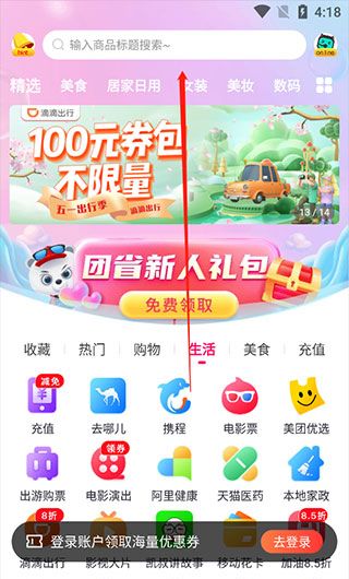 2、点击搜索商品,别忘记了首页的优惠券活动哦。