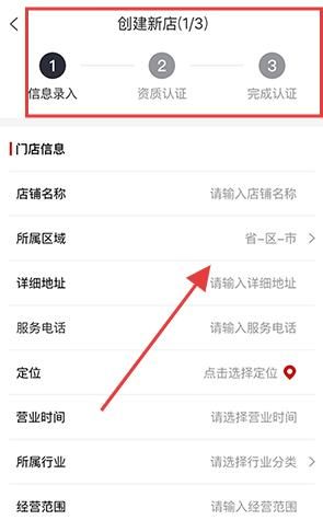 3、打开信用付掌柜APP进入创建新店页面,在信息录入环节,依次输入店铺名称所属区域等门店信息,按步骤推进新店创建。