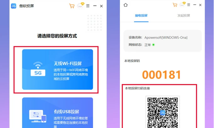 2、在电脑上打开傲软投屏,点击无线WiFi投屏,可看到【本地投屏扫码连接】下方的二维码。