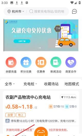 1、点击首页显示定位杭州,有搜索功能,含余额充值等板块,呈现久融充电优惠及充电站信息。