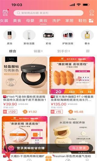 1、首页聚焦美妆品类,分类展示底妆彩妆等商品,支持综合销量排序,标注券后价与返利,是美妆商品的选购入口。