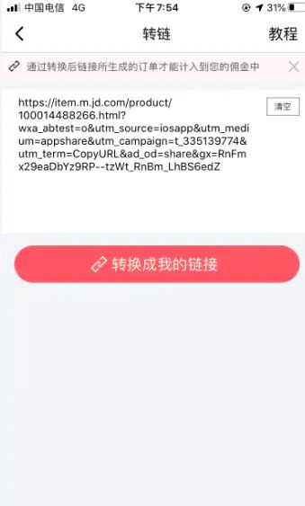 4、在打开的转链页面中将刚才的链接粘贴进去后点击【转换成我的链接】。