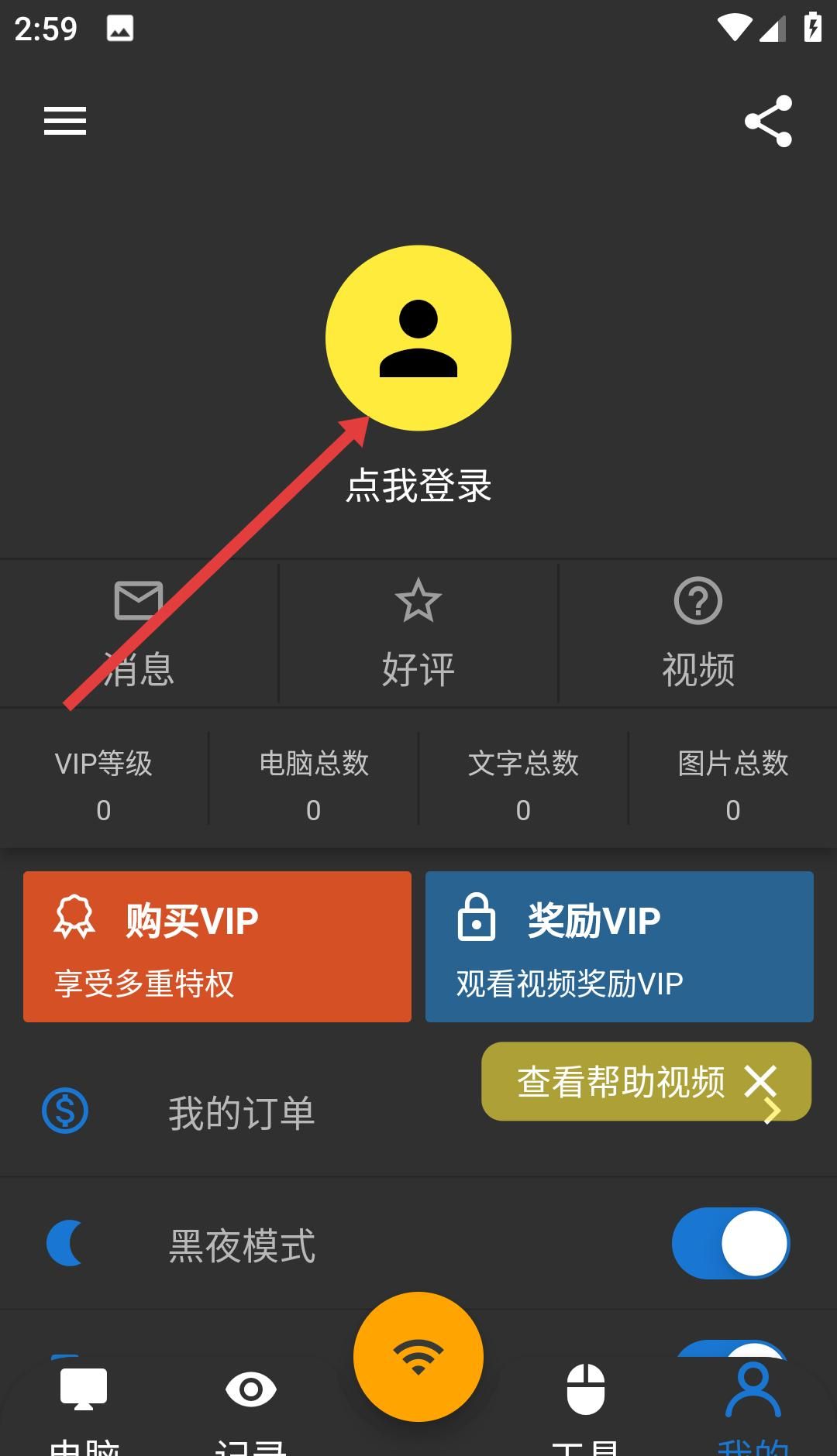 3、在我的界面,点击点我登录可进行账号登录操作,还能看到购买VIP、奖励VIP等功能选项,以及查看消息、好评、视频等内容。