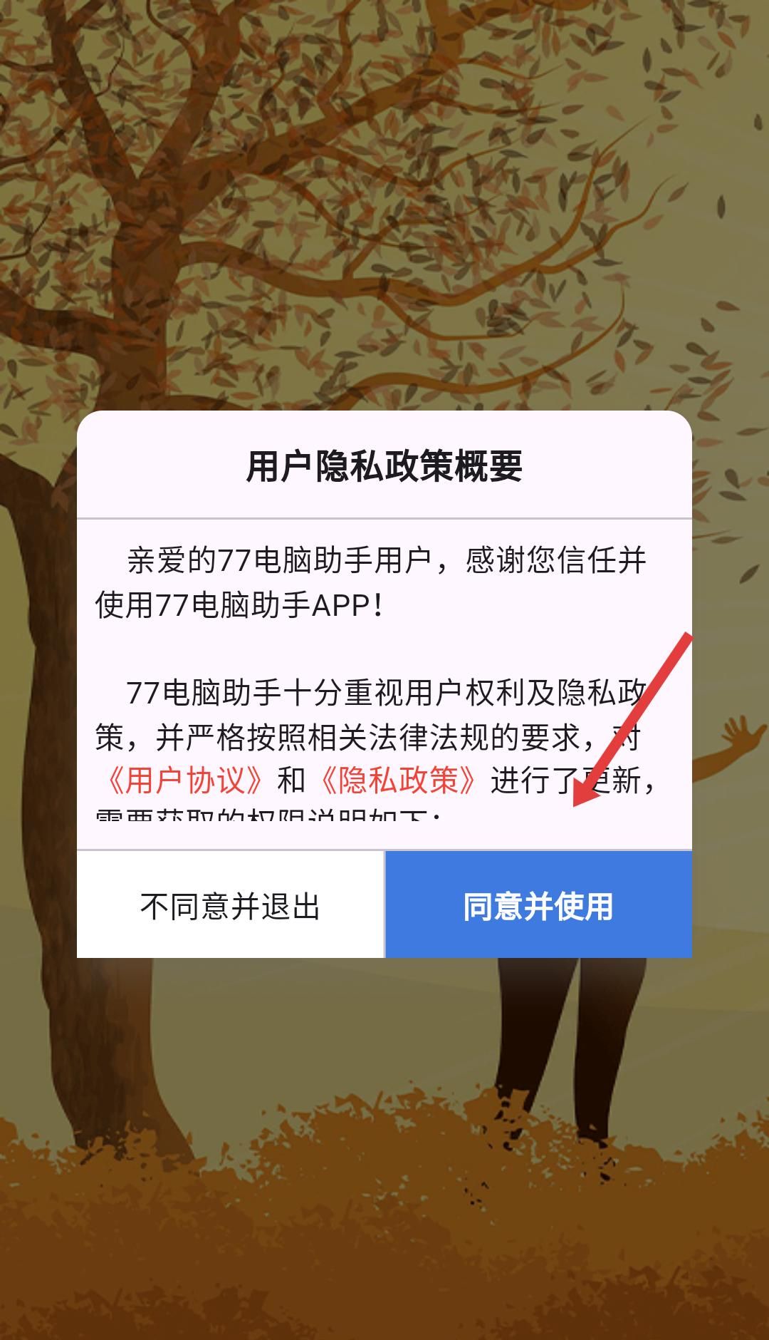 1、使用77电脑助手app,需先在用户隐私政策概要弹窗点击同意并使用,接受相关协议才能继续。