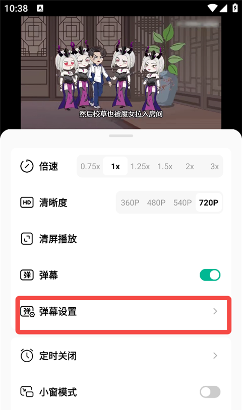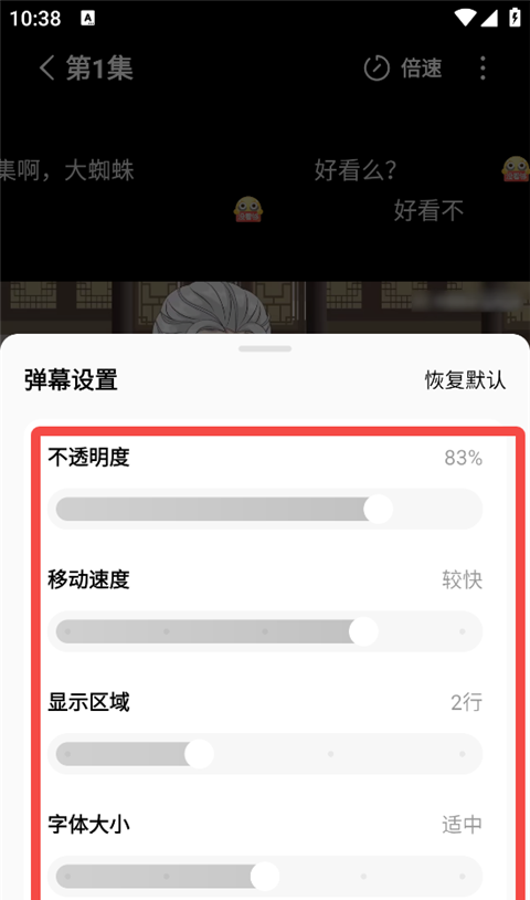 3、在此用户可以调节弹幕的透明毒、移动速度、显示区域等。