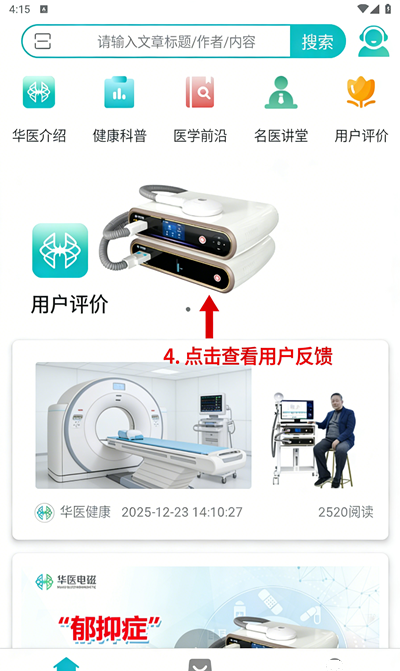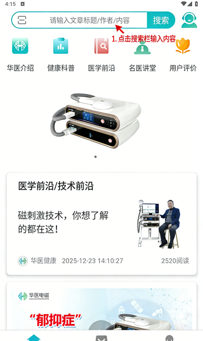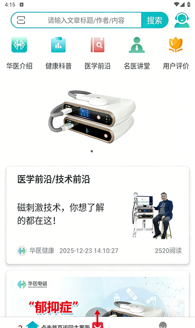 1、打开软件,进入首页界面。顶部有搜索栏可输入文章标题或内容,下方展示 “华医介绍”“健康科普” 等功能模块。