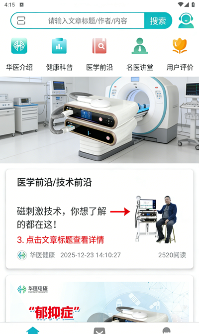 2、点击 “医学前沿” 板块,查看相关技术文章。如图示可浏览 “磁刺激技术” 等前沿内容,了解行业动态。