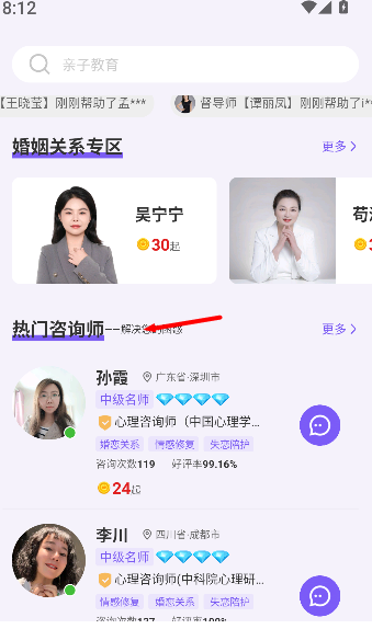 1、进入软件主页后,查看热门咨询师的显示列表。通过浏览每位导师的个人介绍和专业领域来增强您的理解。