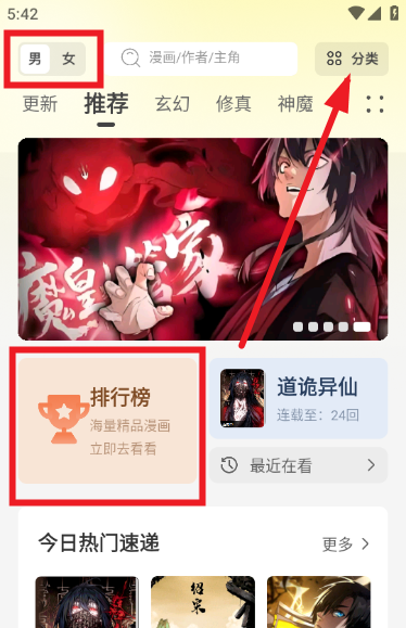 1、所有漫画都是免费的,一旦你进入软件,你就可以在男性和女性模式之间自由切换。还有一些类别可以过滤你最喜欢的漫画,你也可以查看排名等。