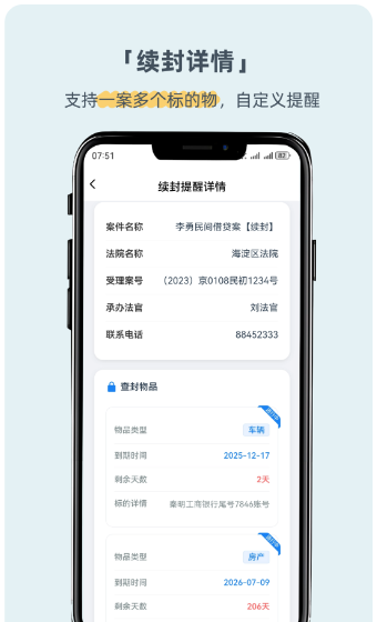 3、续封提醒:自动跟踪并提醒财产保全及执行的续封日期,避免因过期导致的重大失误,支持同案多个查封物品记录及分别提醒。