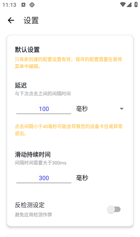 2、进入设置页面,根据需求设置延迟、滑动持续时间等参数,也可使用内置录制功能记录手指动作。
