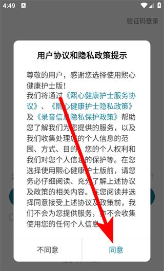 1、打开熙心健康护士版应用程序,点击弹出窗口中的“同意”按钮,然后进入密码登录界面。