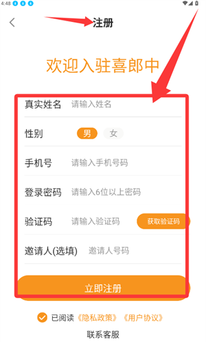 2、在注册界面填写个人信息和验证码,点击注册完成创建。