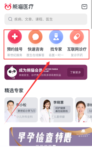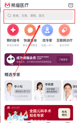 1、主界面搜索框支持多维内容检索,包括疾病知识、健康文章、医学课程和医生信息。