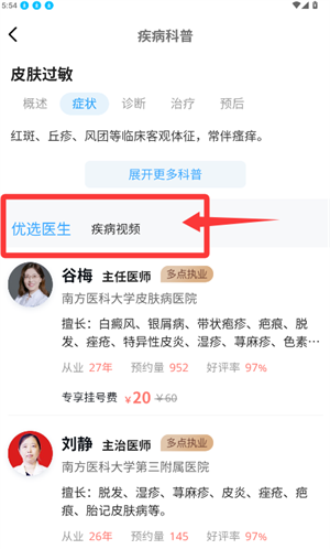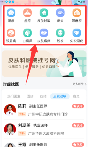 1、在主页上选择皮肤过敏类别,进入科普医生列表页面。