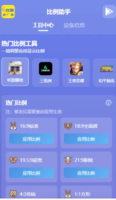 比例助手(手机变平板)app是一款专门为《和平精英》等游戏打造的图像质量优化工具。它可以将游戏画面比修改为16比9,同时还支持多种尺度修改,如8P模型比、平板电脑比、黑边广角比1。这款软件功能强大。用户可以自由修改各种数据的参数,系统自身的一些数据也可以进行修改,使其操作非常方便。它不仅可以提高游戏质量,快速发现敌人的踪迹,掌握游戏情况,更好地体验游戏过程,甚至可以提高射击准确度,帮助你顺利吃鸡。