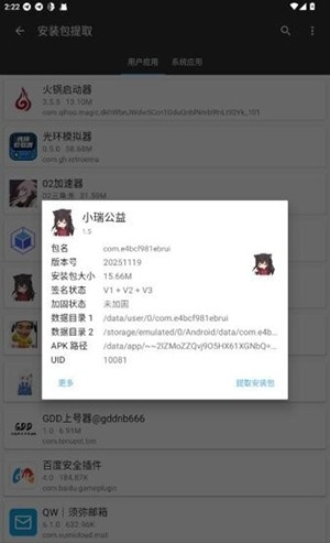2、点击任意应用条目,即可进入详情弹窗或详情页,在这里您可以核对包名、版本号及大小等信息,确认无误后继续操作。