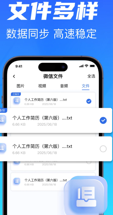 除了聊天记录,应用还提供照片、视频、音频等本地文件的一键式全量备份功能。当手机存储空间告急时,用户无需手动筛选删除,只需通过该应用将不常查看但又重要的文件转移至云端,即可释放手机空间,同时确保数据安全可访问。