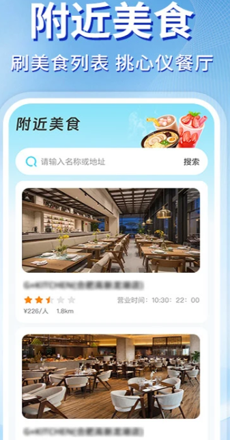 美食发现:精准定位周边餐厅,展示真实用户评分、距离和营业时间。