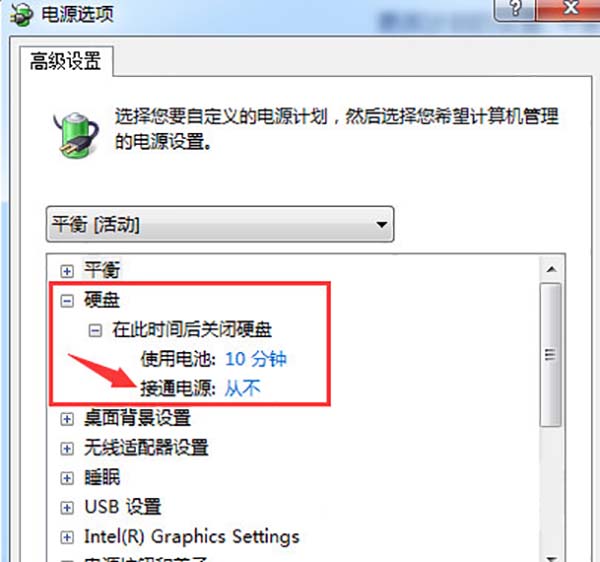 控制面板 电源选项 选择的 【平衡】 或 【节能】后面的 【 更改计划设置 】 【 更改高级电源设置】
