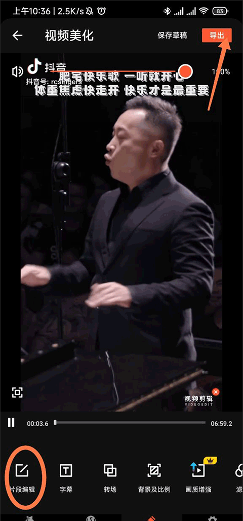 3、现在我们可以看到我选择的三个视频,它们被合并成一个6分59秒的视频。此时,我们可以在编辑区域中编辑剪辑以将其删除。将它们拼接在一起后,单击右上角的“√”进行确认并导出。